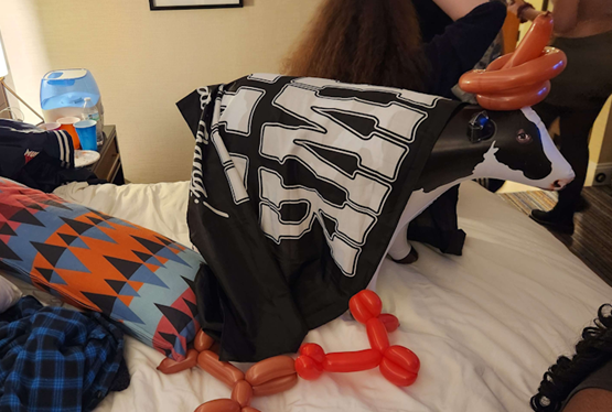 “Hey! Is Firethorn here? We just DMed him.” I looked past the guys working the door to see Firethorn in a bright orange beanie and a similarly bright blue shirt with cut-off sleeves. “That’s him in the PaRappa Cosplay.”