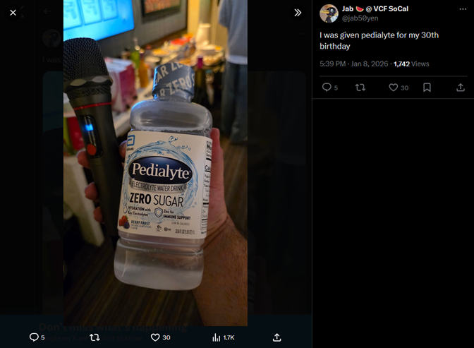 As is my custom for birthday Parties (emphasis on capital P), I brought along a bottle of pedialyte as a birthday gift. It’s a safe option, one that allows me to bring something that isn’t booze, one that demonstrates that I’m willing to contribute, and one that shows that I want the celebrated to be able to enjoy the day after their birthday as well. I have no idea if the celebrated used it or not, though they certainly posted about it. I was already in the door, but this ensured that I was able to at least have some ins on conversations. After all, it was just me and my wife. We were wearing clothes that could only be described as “normie-core”, what with me in my sweater and chinos and she in her cardigan and jeans. One of the people who was working the door told Erin later “I wasn’t sure if you all were in the right place. You looked a little too normal.” (or something to that effect)↩︎
